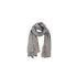 The Belize scarf in gray features a blush striped geometric pattern and soft fringe along the edge. This scarf has an elegant look that is still relaxed and casual.