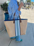 Our stylish jute tote with classic blue and white stripes is a great addition to your wardrobe Sturdy enough to carry towels, sunscreen, hat and food for the beach or use it to shop on Tuesday at the MB Farmers Market.
